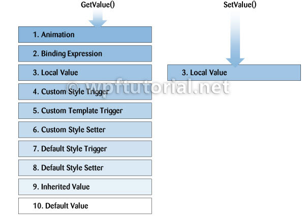 Every time you access a dependency property, it internally resolves the value by following the precedence from high to low. It checks if a local value is available, if not if a custom style trigger is active,... and continues until it founds a value. At last the default value is always available.