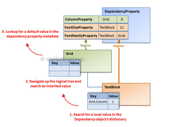 When you access a dependency property over its .NET property wrapper, it internally calls GetValue(DependencyProperty) to access the value. This method resolves the value by using a value resolution strategy that is explained in detail below. If a local value is available, it reads it directly from the dictionary. If no value is set if goes up the logical tree and searches for an inherited value. If no value is found it takes the default value defined in the property metadata. This sequence is a bit simplified, but it shows the main concept.